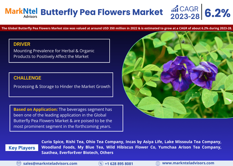 According to the latest report, The Global Butterfly Pea Flowers Market size was valued at around USD 350 million in 2022 & is estimated to grow at a CAGR of about 6.2% during the forecast period, i.e., 2023-28.  The report demonstrates the prominent factors propelling the exponential growth of the Global Butterfly Pea Flowers industry.
